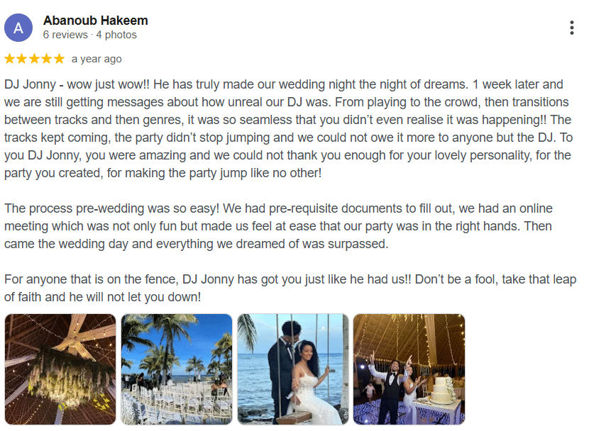 For anyone that is on the fence, DJ Jonny has got you just like he had us!! Don’t be a fool, take that leap of faith and he will not let you down! – view the testimonial