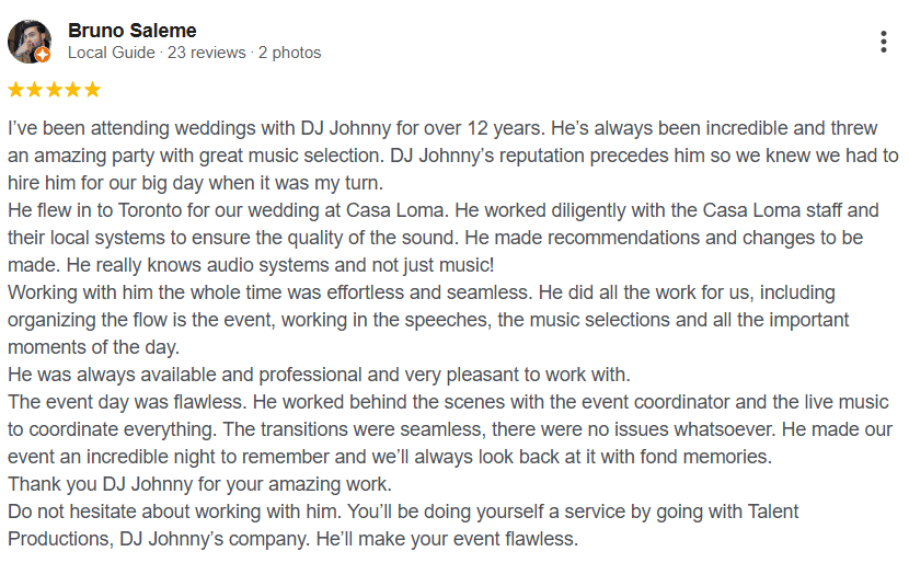 Do not hesitate about working with him. You’ll be doing yourself a service by going with Talent Productions, DJ Johnny’s company. He’ll make your event flawless. – view the testimonial