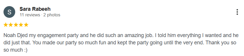 Noah Djed my engagement party and he did such an amazing job. I told him everything I wanted and he did just that. You made our party so much fun and kept the party going until the very end. Thank you so so much 🙂 – view the testimonial