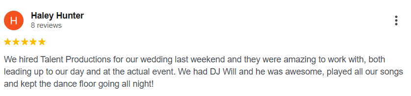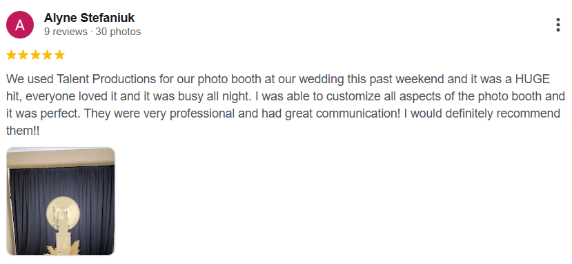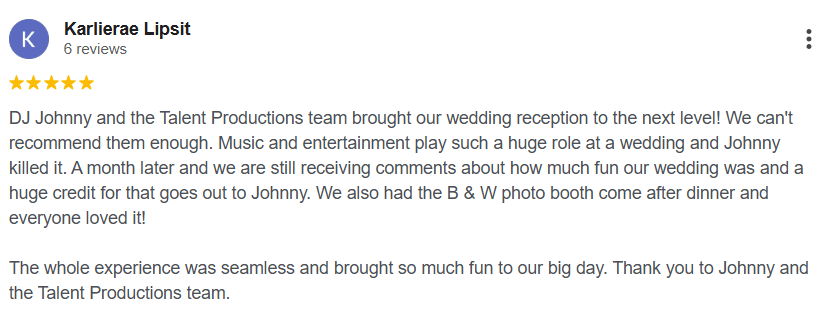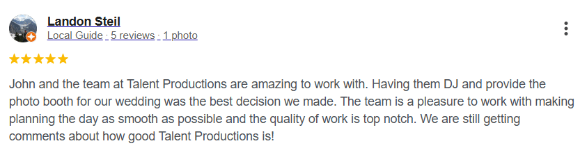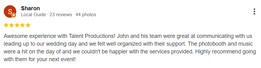 Awesome experience with Talent Productions! John and his team were great at communicating with us leading up to our wedding day and we felt well organized with their support. The photobooth and music were a hit on the day of and we couldn’t be happier with the services provided. Highly recommend going with them for your next event! – view the testimonial