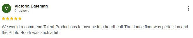 We would recommend Talent Productions to anyone in a heartbeat! The dance floor was perfection and the Photo Booth was such a hit. – view the testimonial