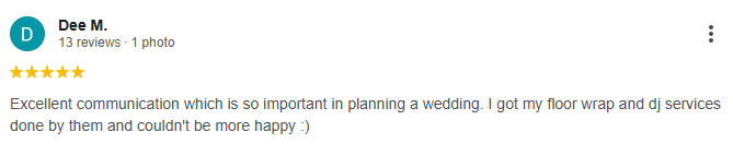 Excellent communication which is so important in planning a wedding. I got my floor wrap and dj services done by them and couldn’t be more happy 🙂 – view the testimonial