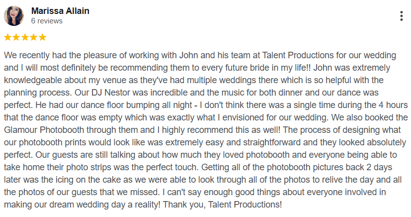 We recently had the pleasure of working with John and his team at Talent Productions for our wedding and I will most definitely be recommending them to every future bride in my life!! John was extremely knowledgeable about my venue as they’ve had multiple weddings there which is so helpful with the planning process. Our DJ Nestor was incredible and the music for both dinner and our dance was perfect. He had our dance floor bumping all night – I don’t think there was a single time during the 4 hours that the dance floor was empty which was exactly what I envisioned for our wedding. We also booked the Glamour Photobooth through them and I highly recommend this as well! The process of designing what our photobooth prints would look like was extremely easy and straightforward and they looked absolutely perfect. Our guests are still talking about how much they loved photobooth and everyone being able to take home their photo strips was the perfect touch. Getting all of the photobooth pictures back 2 days later was the icing on the cake as we were able to look through all of the photos to relive the day and all the photos of our guests that we missed. I can’t say enough good things about everyone involved in making our dream wedding day a reality! Thank you, Talent Productions! – view the testimonial