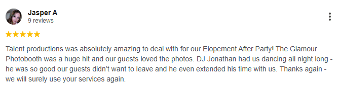 Talent productions was absolutely amazing to deal with for our Elopement After Party! The Glamour Photobooth was a huge hit and our guests loved the photos. DJ Jonathan had us dancing all night long – he was so good our guests didn’t want to leave and he even extended his time with us. Thanks again – we will surely use your services again. – view the testimonial