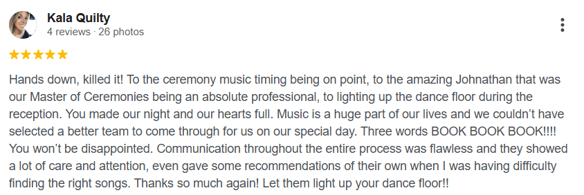 Hands down, killed it! To the ceremony music timing being on point, to the amazing Johnathan that was our Master of Ceremonies being an absolute professional, to lighting up the dance floor during the reception. You made our night and our hearts full. Music is a huge part of our lives and we couldn’t have selected a better team to come through for us on our special day. Three words BOOK BOOK BOOK!!!! You won’t be disappointed. Communication throughout the entire process was flawless and they showed a lot of care and attention, even gave some recommendations of their own when I was having difficulty finding the right songs. Thanks so much again! Let them light up your dance floor!! – view the testimonial