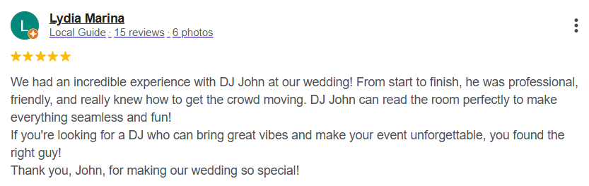 We had an incredible experience with DJ John at our wedding! From start to finish, he was professional, friendly, and really knew how to get the crowd moving. DJ John can read the room perfectly to make everything seamless and fun!