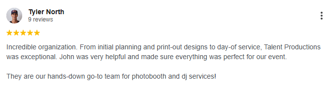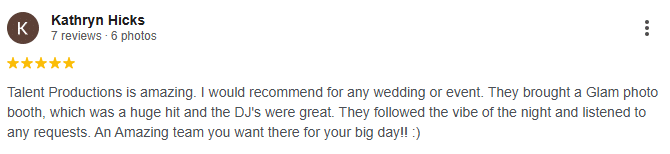 Talent Productions is amazing. I would recommend for any wedding or event. They brought a Glam photo booth, which was a huge hit and the DJ’s were great. They followed the vibe of the night and listened to any requests. An Amazing team you want there for your big day!! 🙂 – view the testimonial