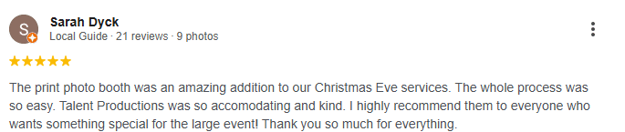 The print photo booth was an amazing addition to our Christmas Eve services. The whole process was so easy. Talent Productions was so accomodating and kind. I highly recommend them to everyone who wants something special for the large event! Thank you so much for everything. – view the testimonial