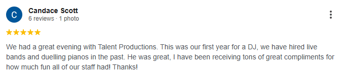 We had a great evening with Talent Productions. This was our first year for a DJ, we have hired live bands and duelling pianos in the past. He was great, I have been receiving tons of great compliments for how much fun all of our staff had! Thanks! – view the testimonial