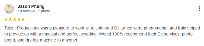 Talent Productions was a pleasure to work with. John and DJ Lance were phenomenal, and truly helped to provide us with a magical and perfect wedding. Would 100% recommend their DJ services, photo booth, and dry fog machine to anyone! – view the testimonial