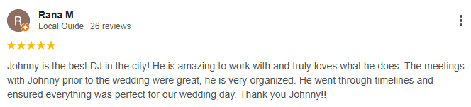 Johnny is the best DJ in the city! He is amazing to work with and truly loves what he does. The meetings with Johnny prior to the wedding were great, he is very organized. He went through timelines and ensured everything was perfect for our wedding day. Thank you Johnny!! – view the testimonial