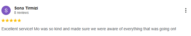 Excellent service! Mo was so kind and made sure we were aware of everything that was going on! – view the testimonial