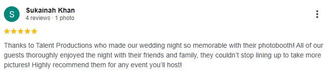Thanks to Talent Productions who made our wedding night so memorable with their photobooth! All of our guests thoroughly enjoyed the night with their friends and family, they couldn’t stop lining up to take more pictures! Highly recommend them for any event you’ll host! – view the testimonial